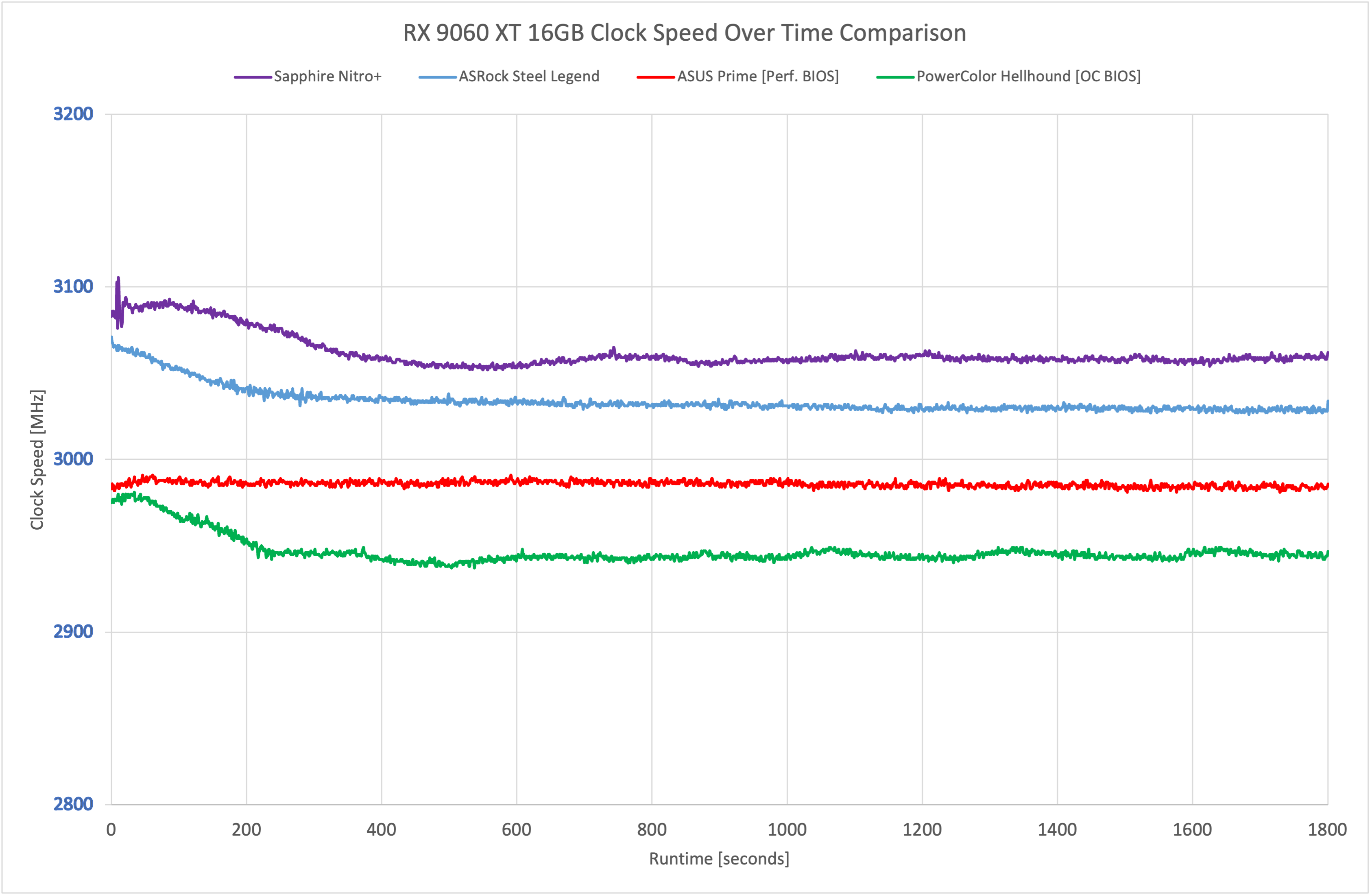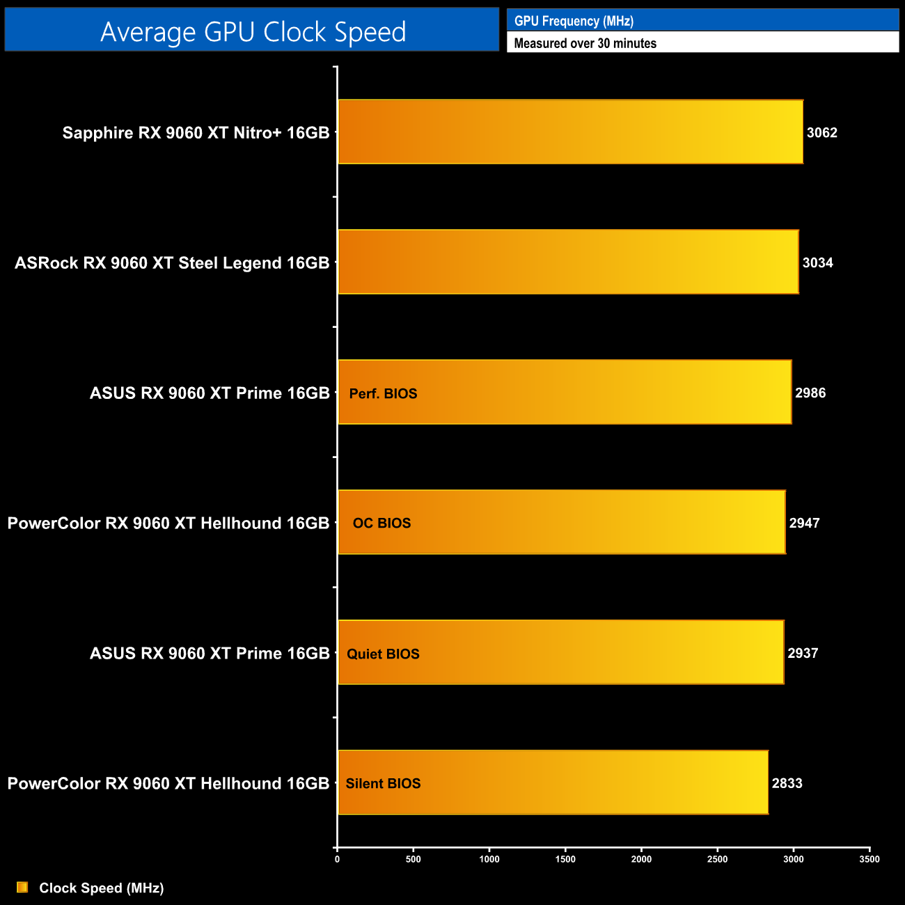 On a technical level, we did see the Nitro+ running the fastest of the three 9060 XTs tested, though the gains are only slight when compared to the ASRock Steel Legend, while the PowerColor Hellhound still stayed above 2900MHz at all times.