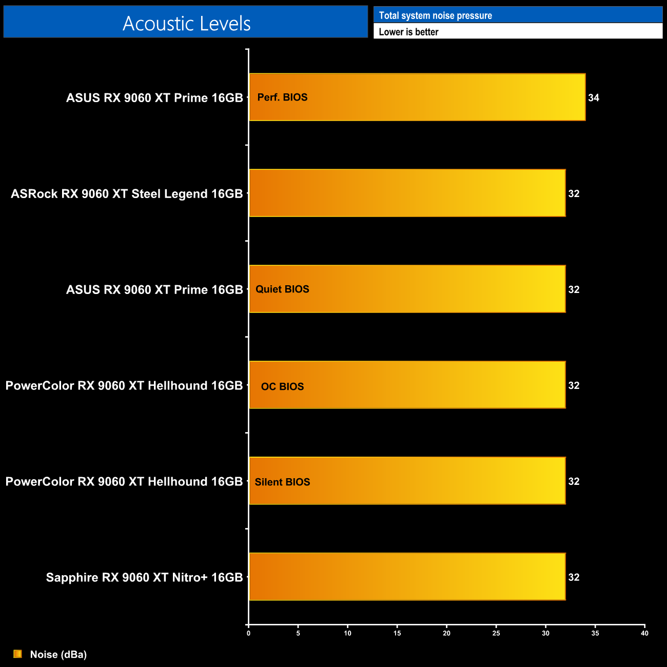 We take our noise measurements with the sound meter positioned 1 foot from the graphics card. I measured the noise floor to be 32 dBA, thus anything above this level can be attributed to the graphics cards. The power supply is passive for the entire power output range we tested all graphics cards in, while all CPU and system fans were disabled. A reading under load comes from running Cyberpunk 2077 for 30 minutes.