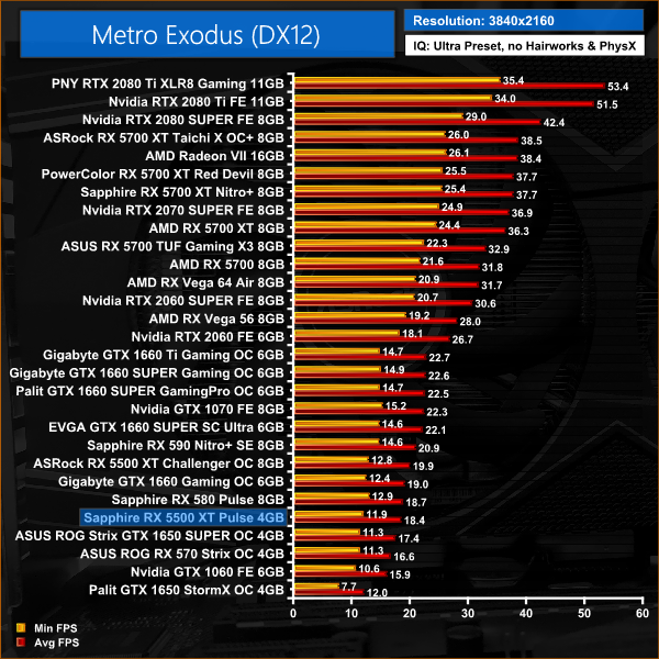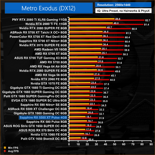 Things swing back the other way in Metro Exodus, this time the Sapphire 5500 XT has a 6% lead over 1650 SUPER. This title is so tough to run, that the 6% margin is just a 2.2FPS difference at 1080p.
