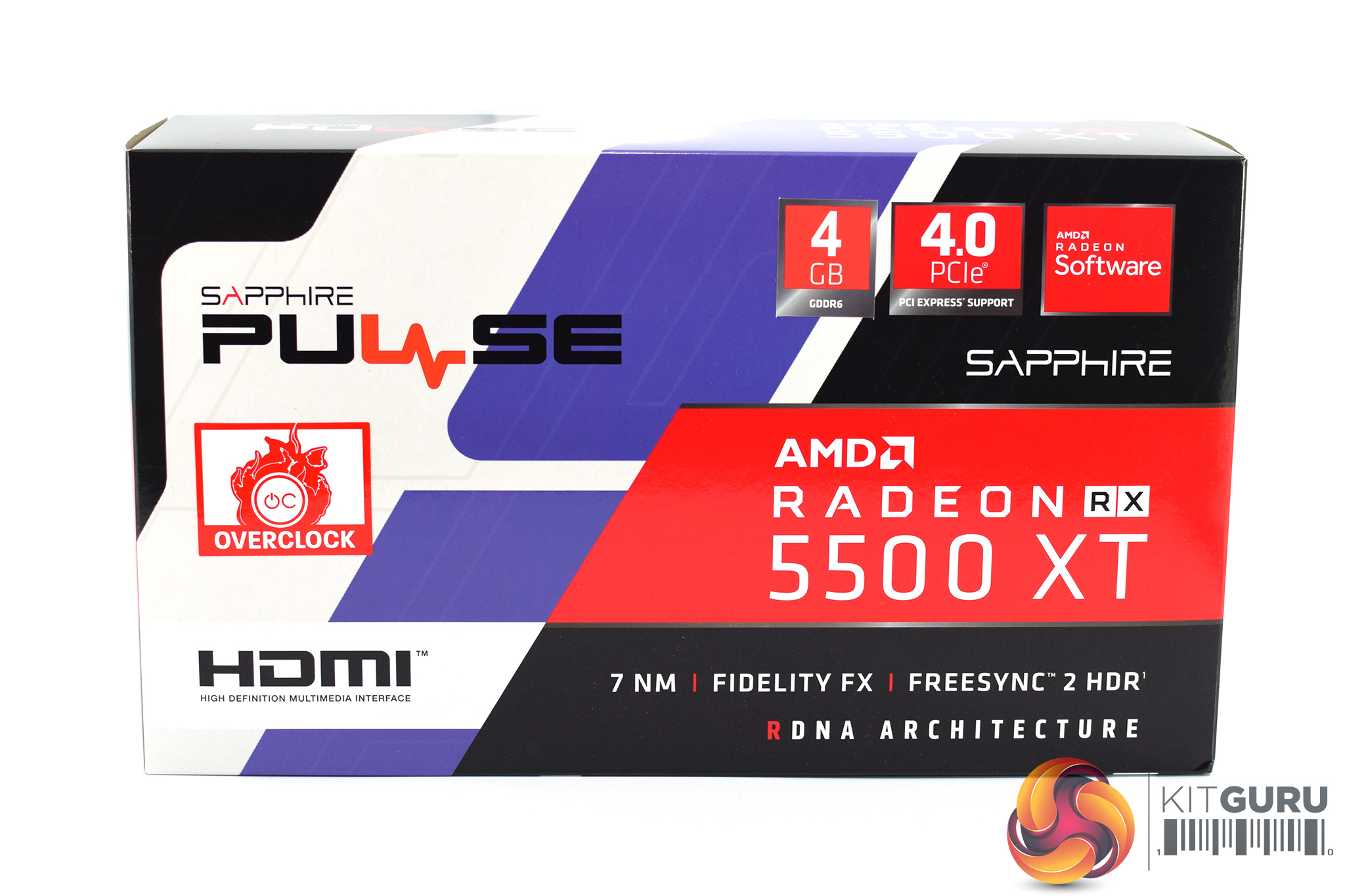 The Sapphire RX 5500 XT Pulse 4GB ships in a multi-coloured box, with prominent AMD Radeon branding visible on the front. There's no image of the card itself here.