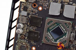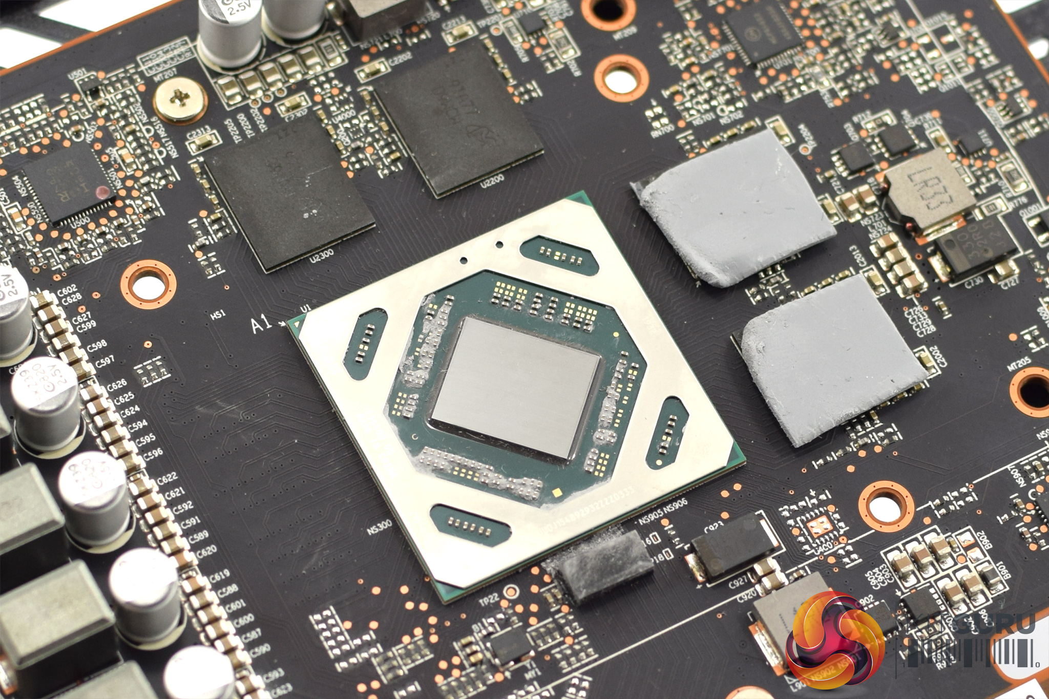Removing the cooler, we can get a look at the very short PCB used here – the cooler and backplate extend beyond the PCB by almost two inches. Still, the PCB itself is almost certainly AMD's reference design, with a 6-phase VRM for the GPU and single-phase VRM for the memory.