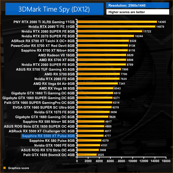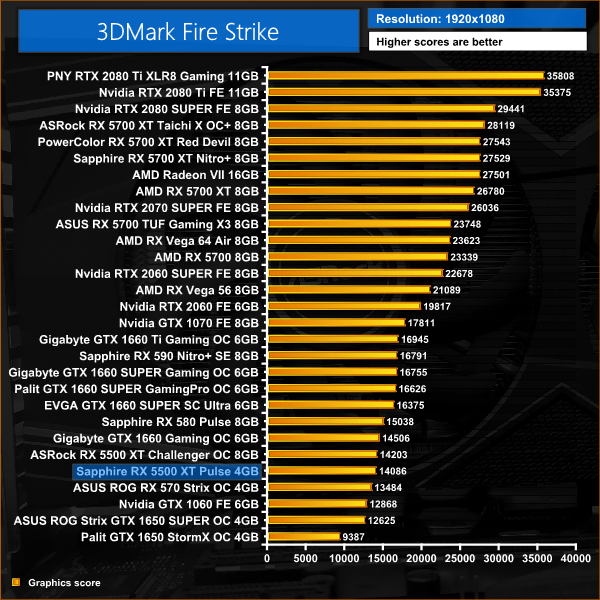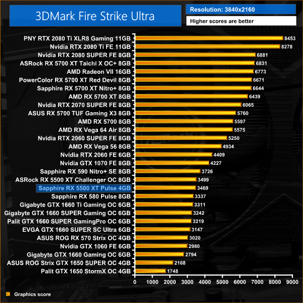Kicking things off with our 3DMark scores, there's a fair bit of variation between the three benchmarks – the 5500 XT produces, comparatively speaking, its best result in Fire Strike Ultra but its Time Spy score is less impressive.