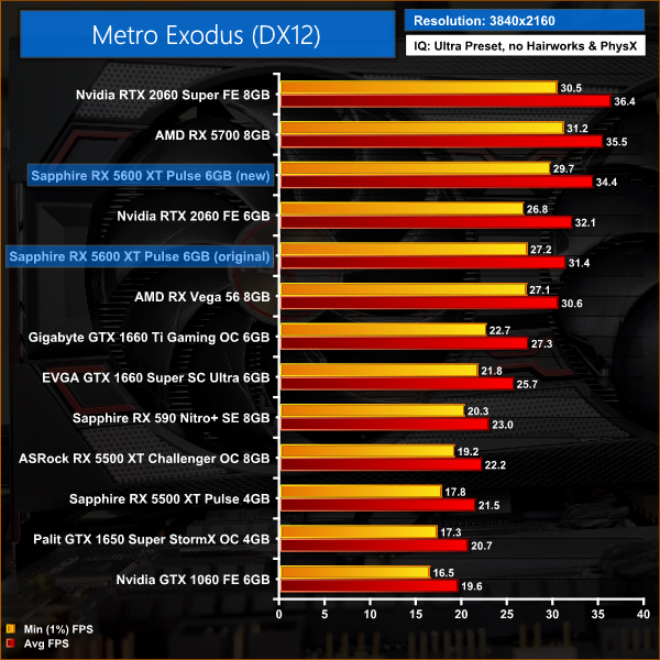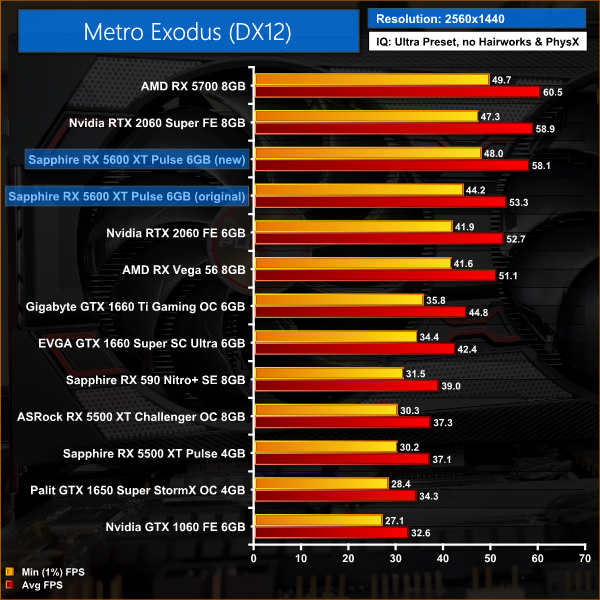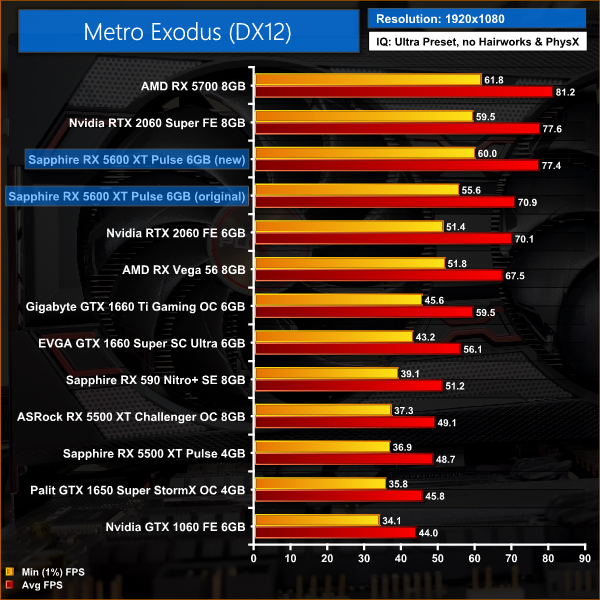 Metro Exodus is another interesting title that, despite being one of the first games with RTX support, does seem to favour AMD hardware. At 1080p, even without the BIOS update our 5600 XT is the marginally faster card when compared to the RTX 2060. With the new update, the 5600 XT outperforms the 2060 by 10%, the second biggest margin across all of our games today.