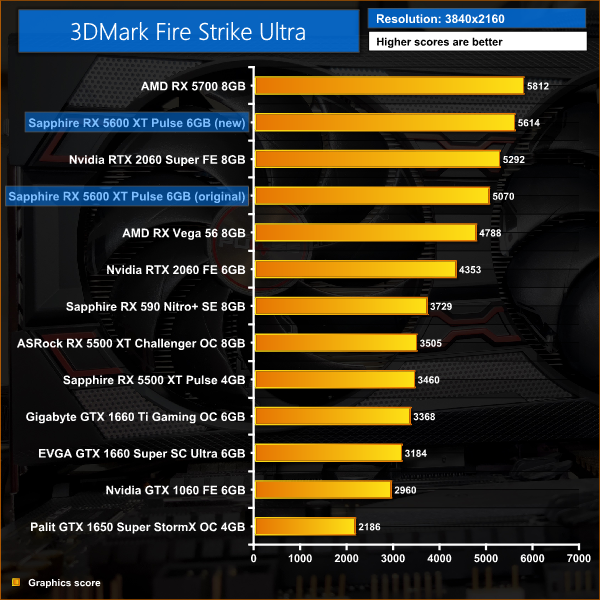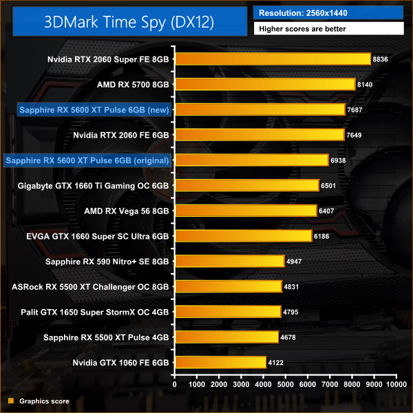With the 1080p Fire Strike strike benchmark, both the original and new 5600 XT BIOS out-scored the RTX, which is not bad at all. In Time Spy, however, the original 5600 XT BIOS was 9% slower than the RTX 2060, but with the BIOS update there is now parity between the two cards in that benchmark.