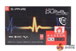 The Sapphire RX 570 Pulse ships in a dark box, with no product photo on the front. However, there is a EKG ‘pulse' graph which obviously ties into the series name.