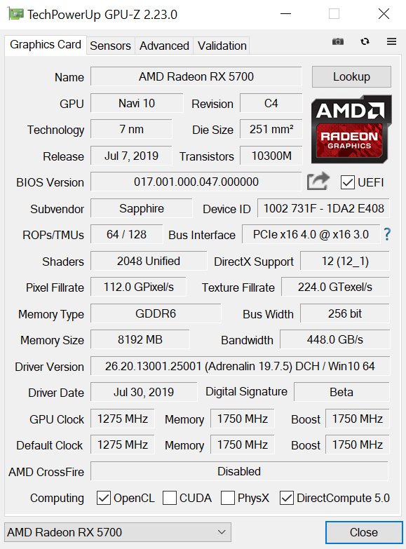 To recap the core spec of the RX 5700, the card is a cut-down version of the new Navi 10 GPU with 36 Compute Units (CUs) and 2304 stream processors. The GPU itself is fabbed on TSMC's 7nm process and has a small die size of 251mm².