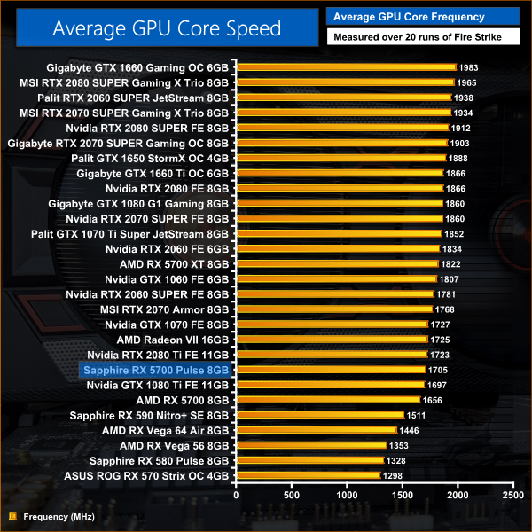 In terms of on-paper specs, reference RX 5700 has a rated game clock of 1625MHz, and the RX 5700 Pulse has a rated game clock of 1700MHz. While the reference card did exceed its rated game clock by around 30MHz, the Pulse averaged 1705MHz, putting it pretty much bang on with its rated clock speed. This gives it a 3% frequency advantage over the reference card, tying in very neatly with the small performance gains we saw from this card in our games testing.
