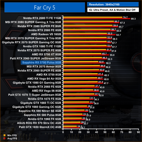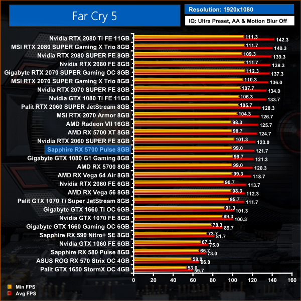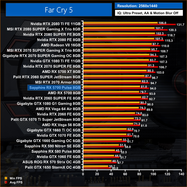 Far Cry 5 has the 5700 neck-and-neck with RTX 2060 SUPER, and yep – you guessed it, the Pulse is on average 2% faster than the reference design in this title.