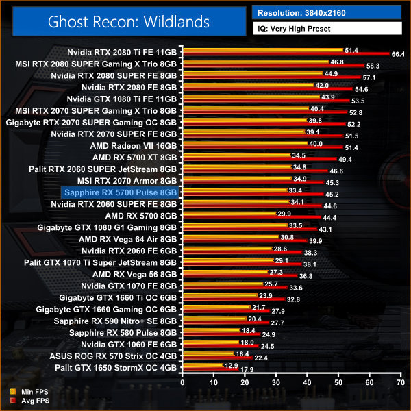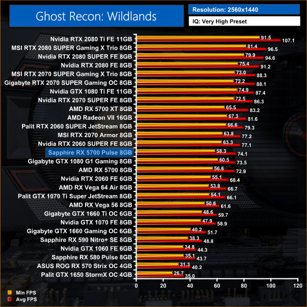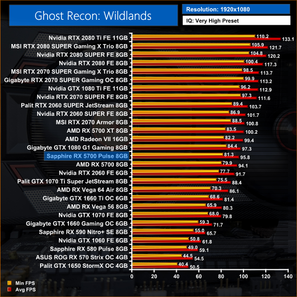 The 2060 SUPER is marginally faster than the RX 5700 Pulse in Ghost Recon: Wildlands, but we're only talking a couple frames at 1080p and 1440p. The Pulse itself is a similar margin ahead of the reference 5700.