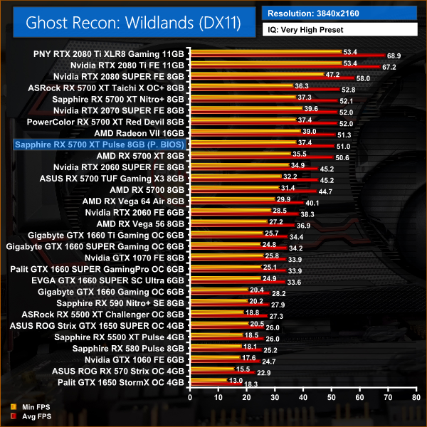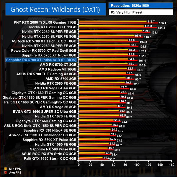 Wildlands sees very similar performance between this Pulse, the reference 5700 XT and the 2070 SUPER – at 1440p, there's not even 3FPS difference between all of those cards.