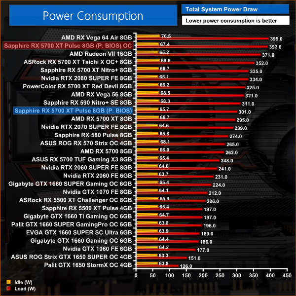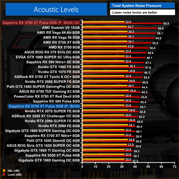 Unfortunately the cooler didn't cope so well with the extra frequency. Edge temperature only rose by 3C, but using the default fan curve we saw noise levels reach ridiculous levels – with over 60dB recorded on our sound meter. Additionally, power draw jumped up by almost 100W, with efficiency going down the drain at the higher clock speeds. I would say a mild overclock is still worth it with the Pulse, but a few tweaks to the fan curve would also help as the default behaviour was far too loud.