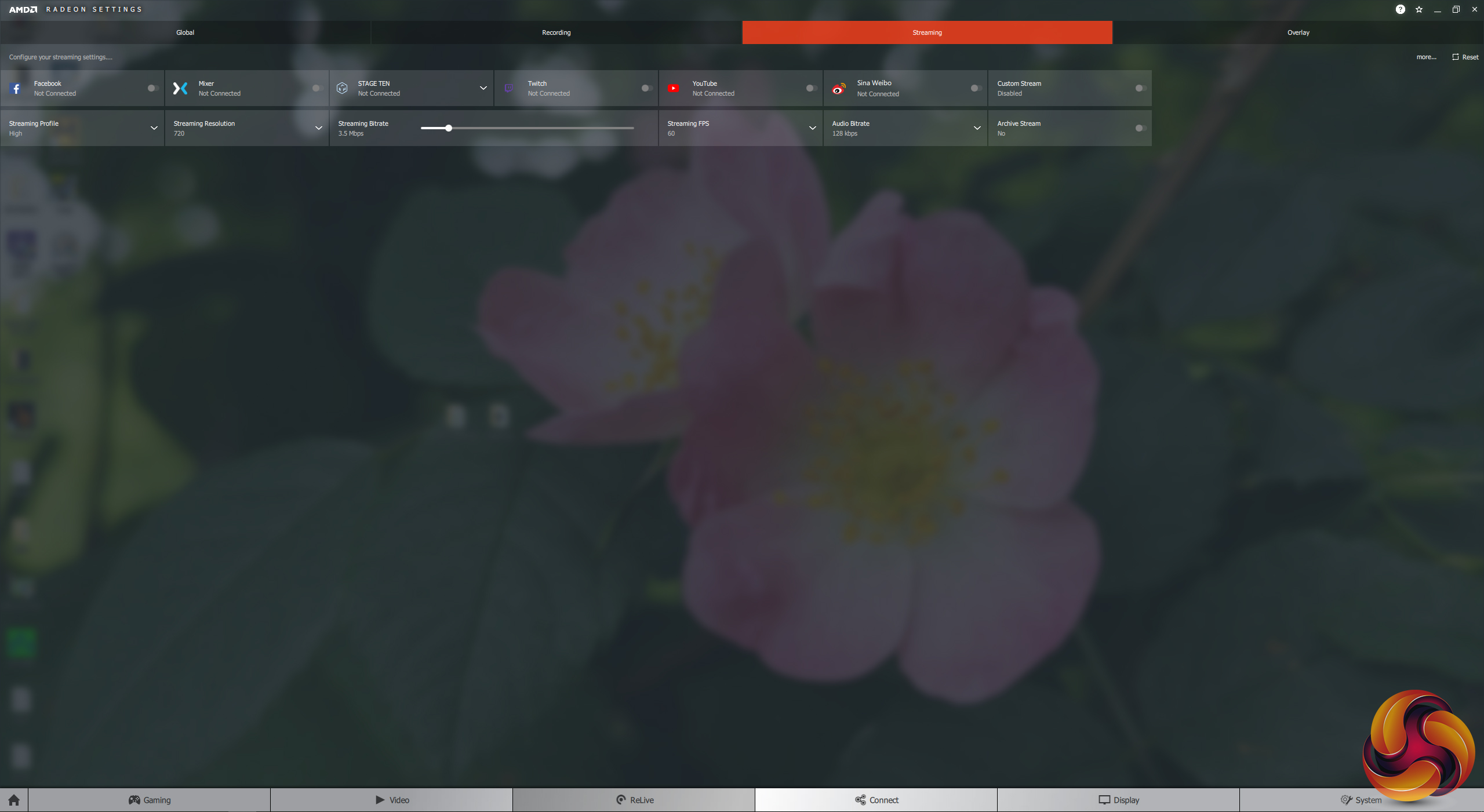 Next is the ‘streaming' tab, which will likely appeal to many Twitch fans – you can link ReLive to various social media and streaming services, allowing you to stream directly onto those services from within ReLive. There are also resolution, bitrate and FPS settings here.