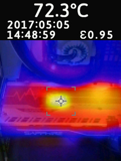 Using one of our thermal imaging camera's I observed a hotspot of 72.3C. This is the area directly behind the GPU core, where there is a small backplate cut-out. The rest of the backplate stayed visibly cooler.