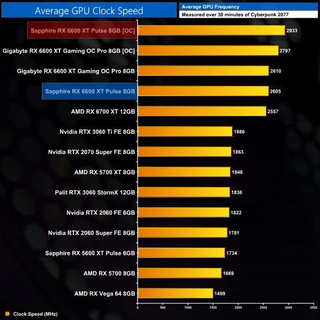 Overclocking the Sapphire Pulse gave slightly better results than the Gaming OC Pro. We were able to push the GPU core up to 2990MHz (!), with the memory set to 2300MHz.