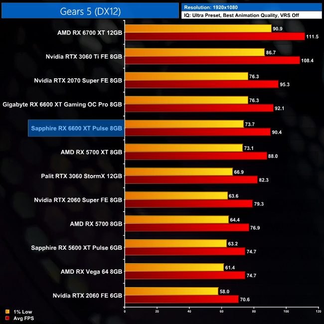 It's not a surprise to see the margins between the Sapphire Pulse and Gigabyte Gaming OC Pro are essentially non-existent in our 1080p game benchmarks. Both are factory overclocked models and are essentially as fast as each other. In fact, the single biggest difference between the two came in Gears 5, and that was a margin of 1.8%. In Cyberpunk 2077, Hitman 3 and Resident Evil Village, the average frame rates fell within 1% of each other.