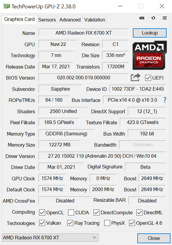 RDNA 2 houses one ray accelerator per CU, so there's a total of 40 with the RX 6700 XT. Four texture units per CU gives a total of 160, while there's also 64 ROPs. The reference 6700 XT has a rated game clock of 2424MHz, but Sapphire has increased this to 2548MHz.