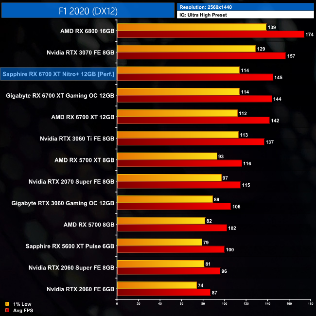 F1 2020 sees the Nitro+ come in 1% slower than the reference 6700 XT at 1080p, but it pushes into a 2% lead at 1440p.