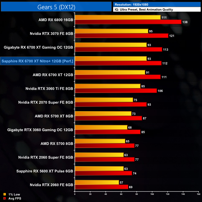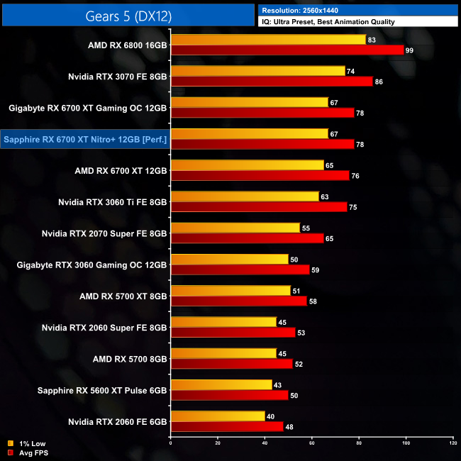 As for Gears 5, this AMD-sponsored title sees the Nitro+ deliver an extra 2FPS compared to the reference card at 1440p – a difference of 3%.