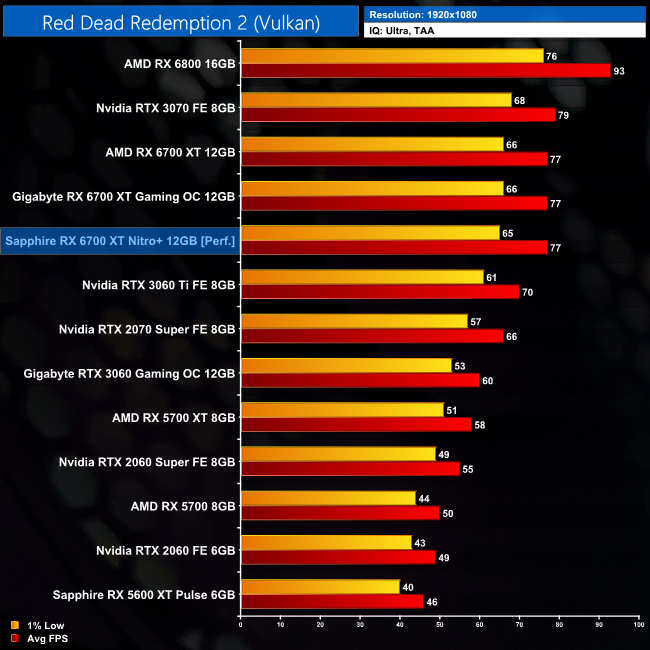 Moving onto Read Dead Redemption 2, here the Nitro+ is exactly as fast as the reference card, at both 1080p at 1440p.