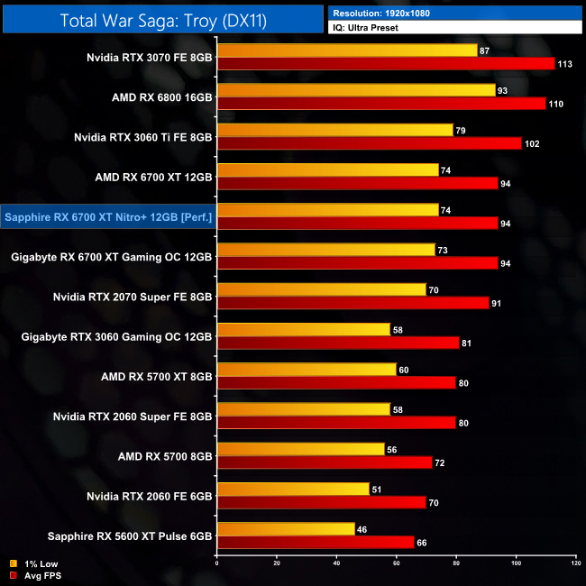Total War Saga: Troy is exactly the same as Red Dead Redemption 2, as we see no difference in frame rates between the Nitro+ and AMD's reference card, at either resolution tested.