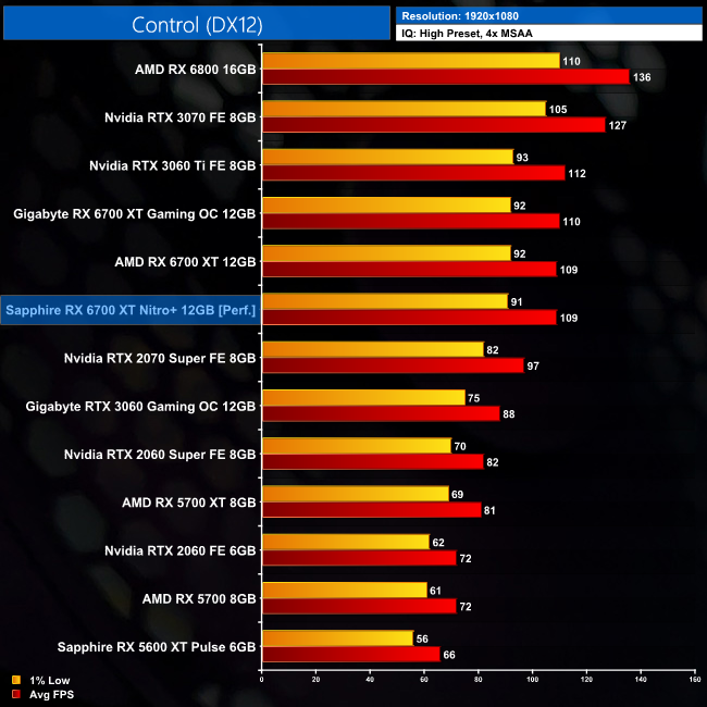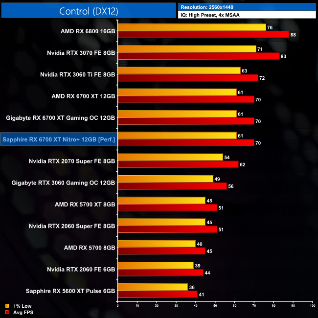 Next is Remedy's Control, where the Nitro+ is dead level with the reference RX 6700 XT, averaging 70FPS at 1440p.