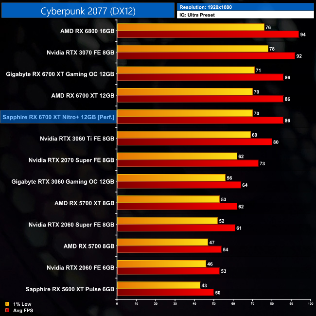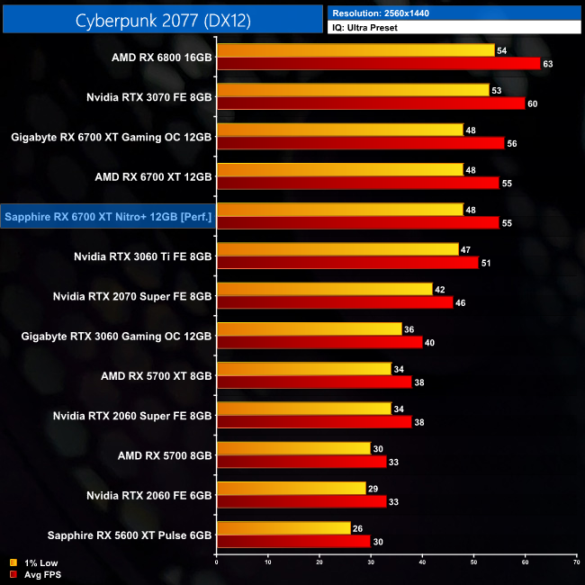 Cyberpunk 2077 is the most demanding game we test, and at 1440p the Nitro+ averages 55FPS, which is again on par with the reference RX 6700 XT.