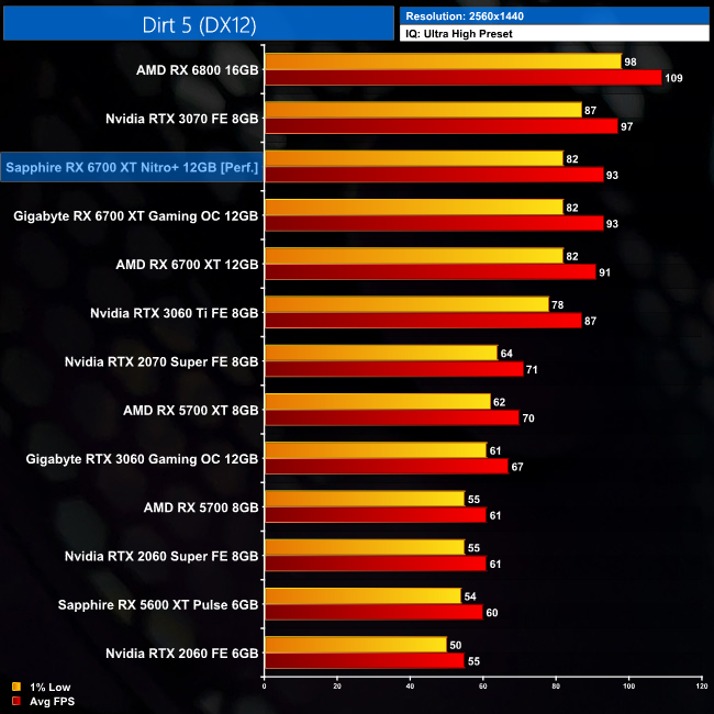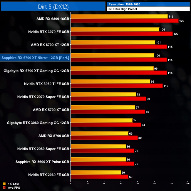 Dirt 5 is another game where there's no difference between the Nitro+ and the reference card at 1080p, but at 1440p the Nitro does take a 2% lead over AMD's design.