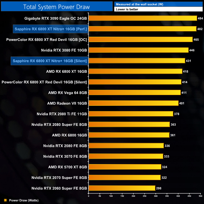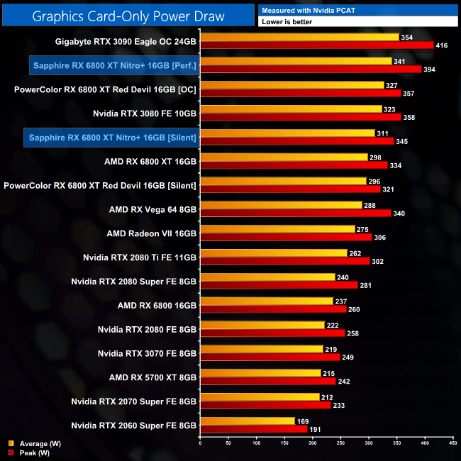 Here, we can see the Nitro+'s Performance BIOS averaged 341W under load, a 14W increased compared to the Red Devil's equivalent BIOS. As for the Nitro's Silent BIOS, this proved more frugal, limiting power draw to 311W, though this is still above both the reference card and the Red Devil's Silent BIOS.