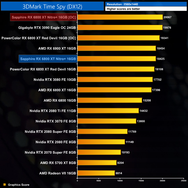 This resulted in gains of between 7-9% in the titles we re-tested, but compared to a stock-clocked reference 6800 XT, the gains came in between 11-15%, which is a pretty sizeable increase over the 6800 XT’s baseline performance.