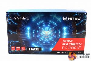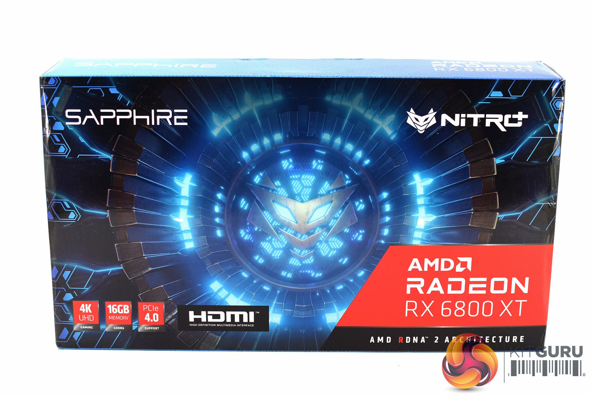 The Sapphire RX 6800 XT Nitro+ ships in a dark blue box, with the Nitro logo visible in a neon blue colour on the front.