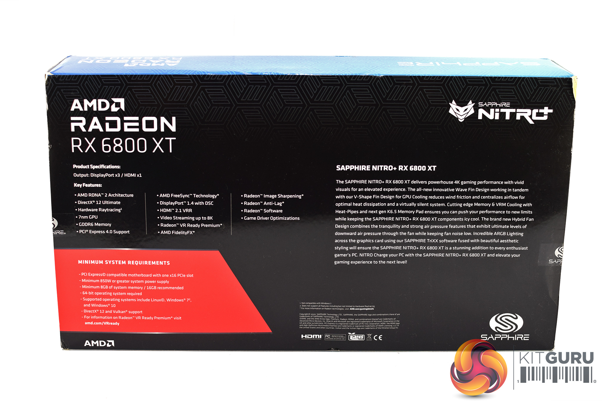 On the back, several specifications of the GPU are listed, while Sapphire also highlights some of the design features of the Nitro+ card.