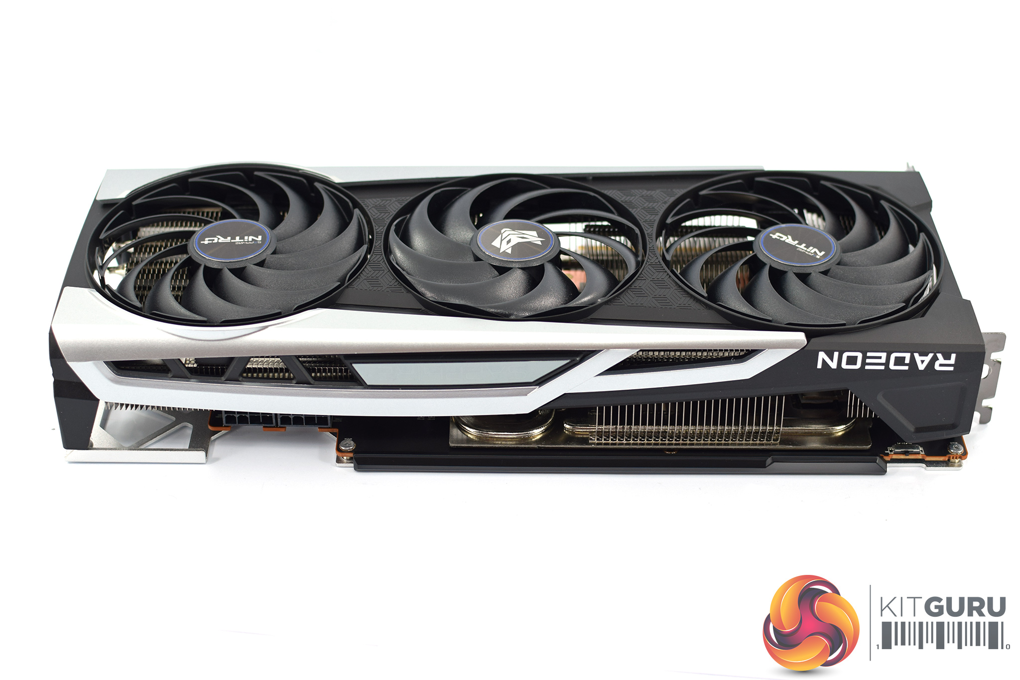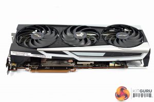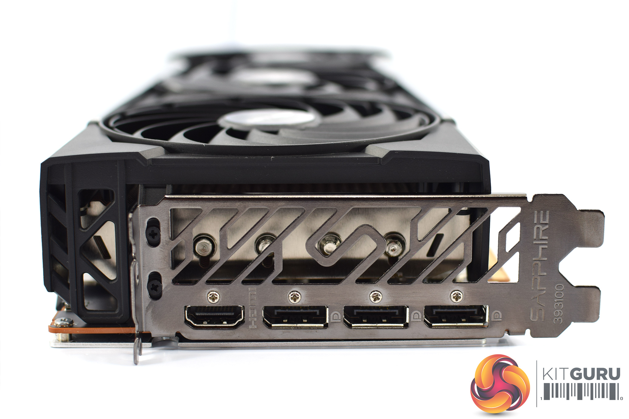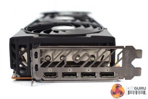 Looking at the fans, here we can see some tweaks to the design. First of all, there’s two 100mm fans at either end, while the central fan is slightly smaller at 90mm. All three feature a new ring around the outer edge of the fan, and Sapphire calls the new design a ‘Hybrid Fan', as they say it is meant to offer the increased pressure of a blower fan combined with the traditional low noise levels of an axial fan. We can also see the central fan spins in reverse, relative to the outer two, similar to what we’ve seen from the likes of Gigabyte and ASUS over the past year or two.