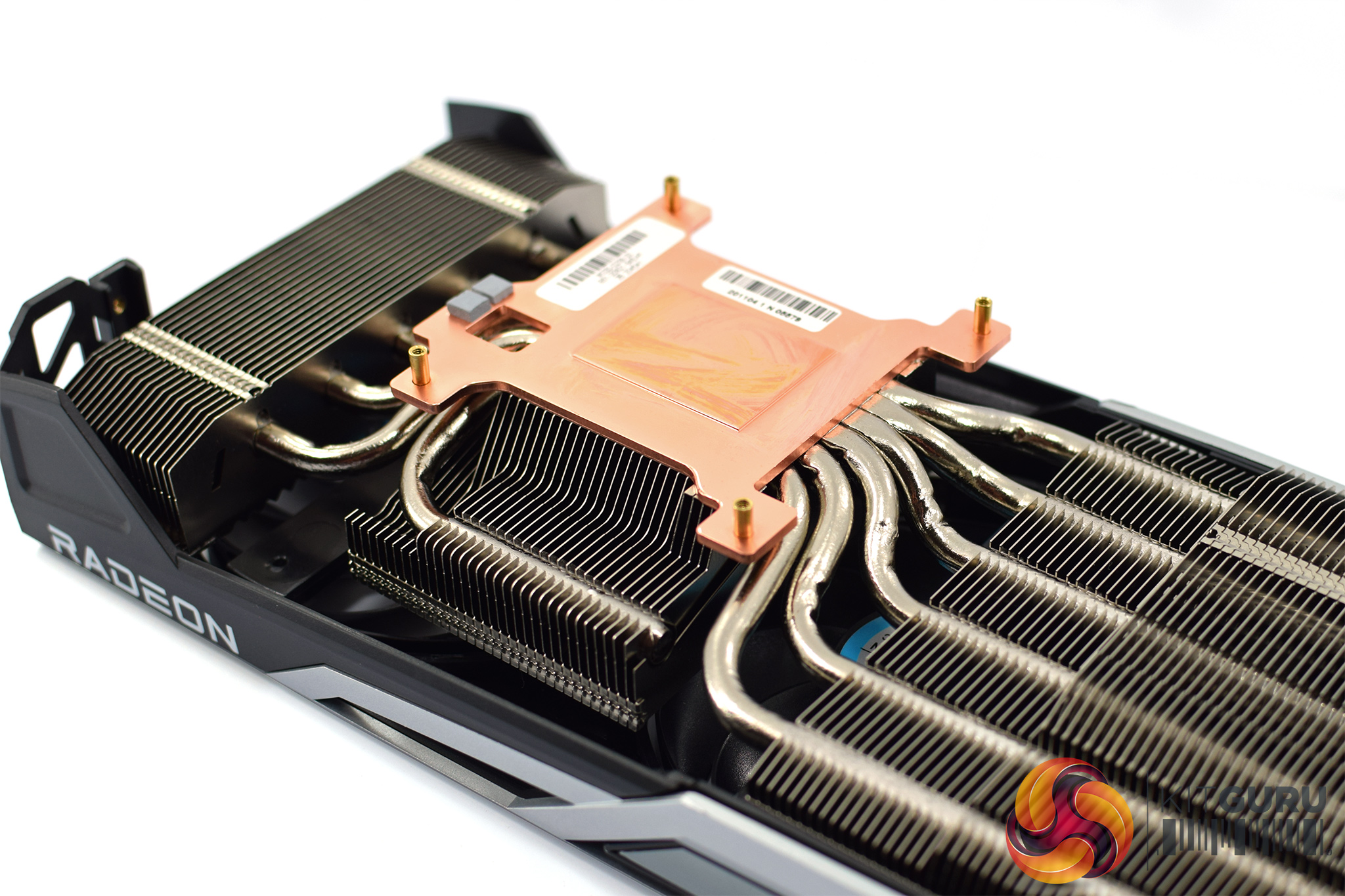 Dissembling the card, the first thing to touch on is the use of a dedicated heatsink for the memory and VRM. This uses a couple of flattened heatpipes and three small fin stacks, contacting with the memory and VRM via thermal pads. The primary heatsink also sports three, much larger fin stacks, connected by 6x 6mm heatpipes. Meanwhile, the GPU die contacts with a copper baseplate.