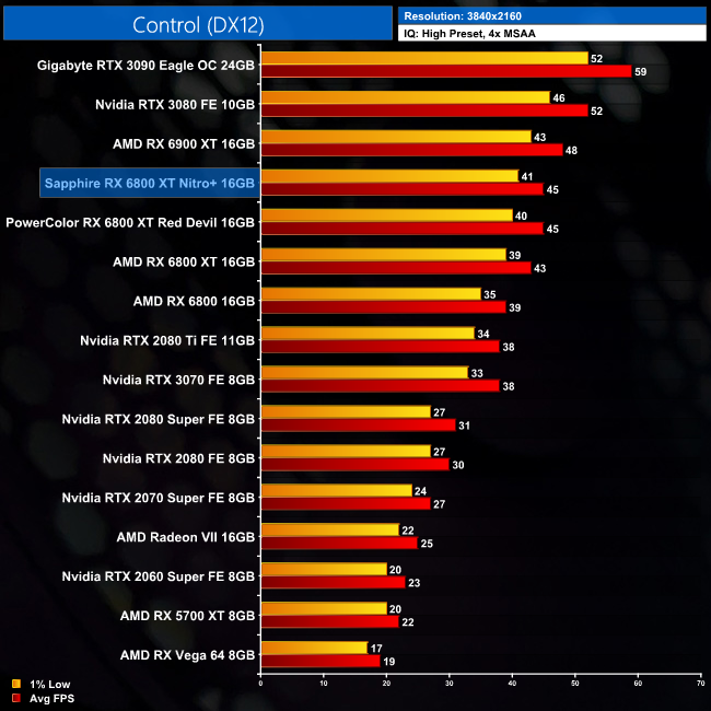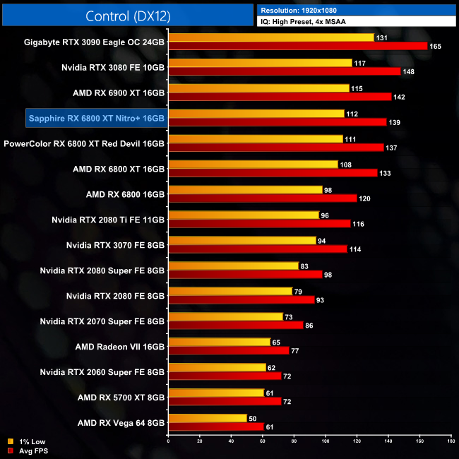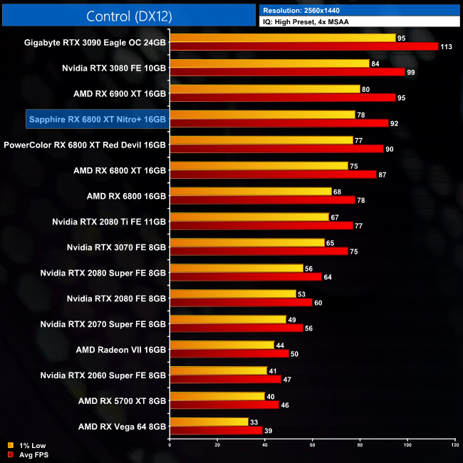 Taking a look at Control, at 1440p the Nitro+ delivers an extra 5FPS over the reference design, which is a difference of 6%, while it is also 2% ahead of the Red Devil.