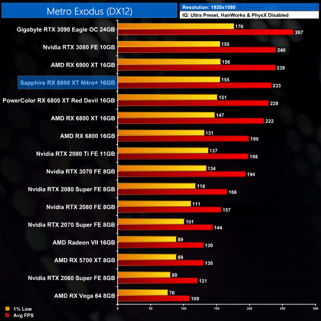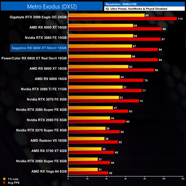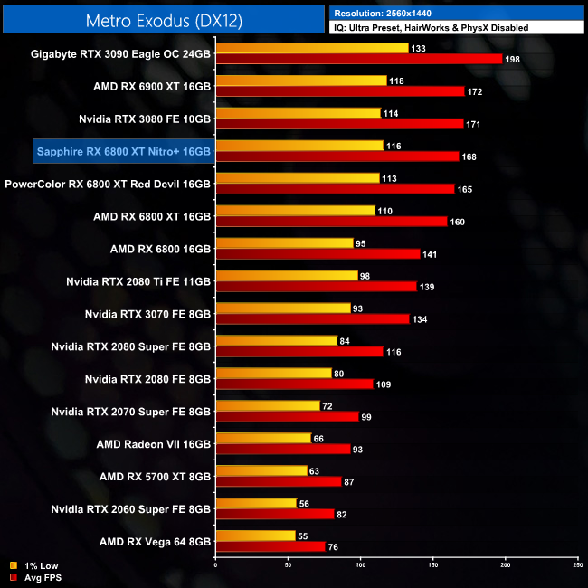 Up next is Metro Exodus, and here the Nitro+ is 5% faster than the reference card at 1440p, while this falls to 4% at 4K. It's again very close to the RX 6900 XT however, being just 2% and 4% slower at 1440p and 4K, respectively.