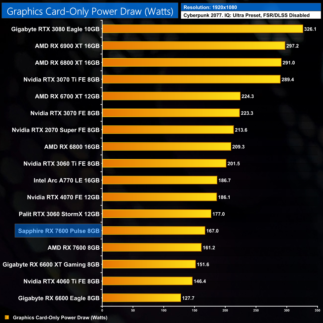 We use Nvidia PCAT to measure power draw of the graphics card only, with readings from both the PCIe slot and the PCIe power cables combined into a single figure. We use Cyberpunk 2077 (4K) for this testing.