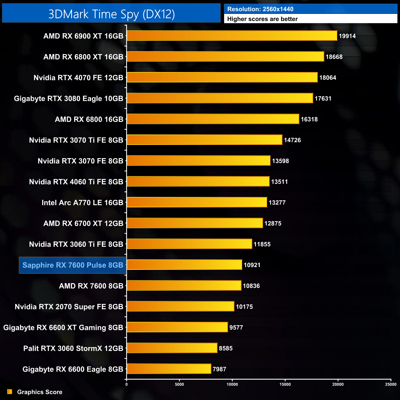 3DMark Time Spy gives a first look at performance and we can see the Pulse sneaks in just ahead of the AMD reference card – the margins are very fine, with the difference being less than 100 points.
