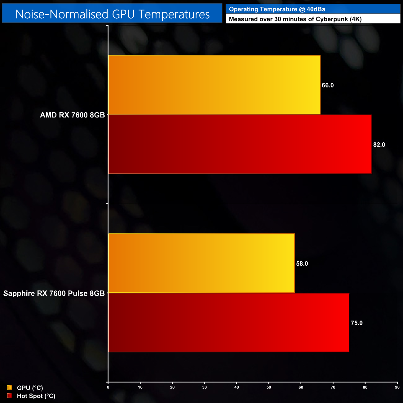 Following on from our stock thermal and acoustic testing, here we re-test the operating temperature of the GPU, but with noise levels normalised to 40dBa. This allows us to measure the efficiency of the overall cooling solution as varying noise levels as a result of more aggressive fan curves are no longer a factor.