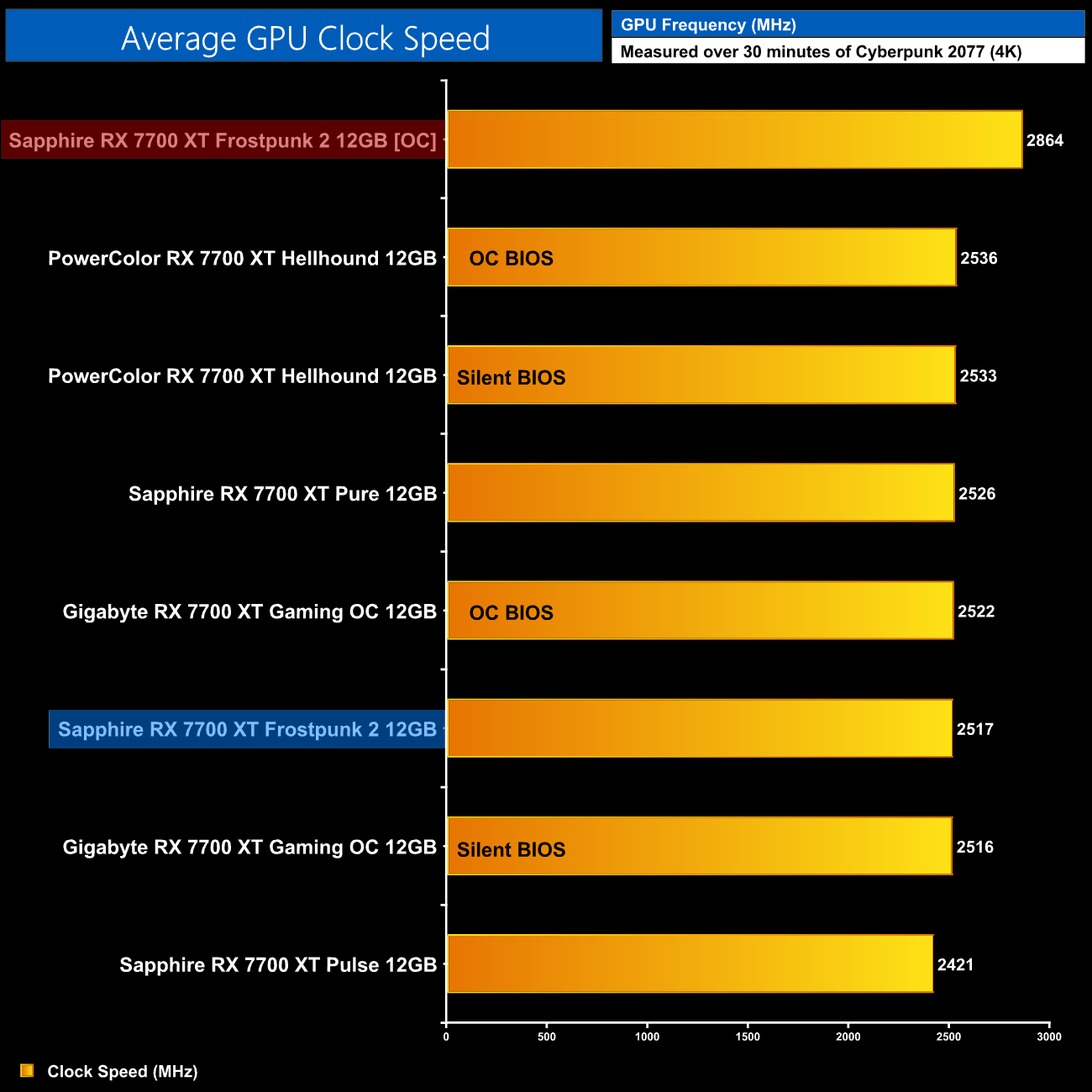This saw our real-world GPU clock speed hit 2864MHz on average over our thirty minute stress test, so about a 250MHz boost over stock.