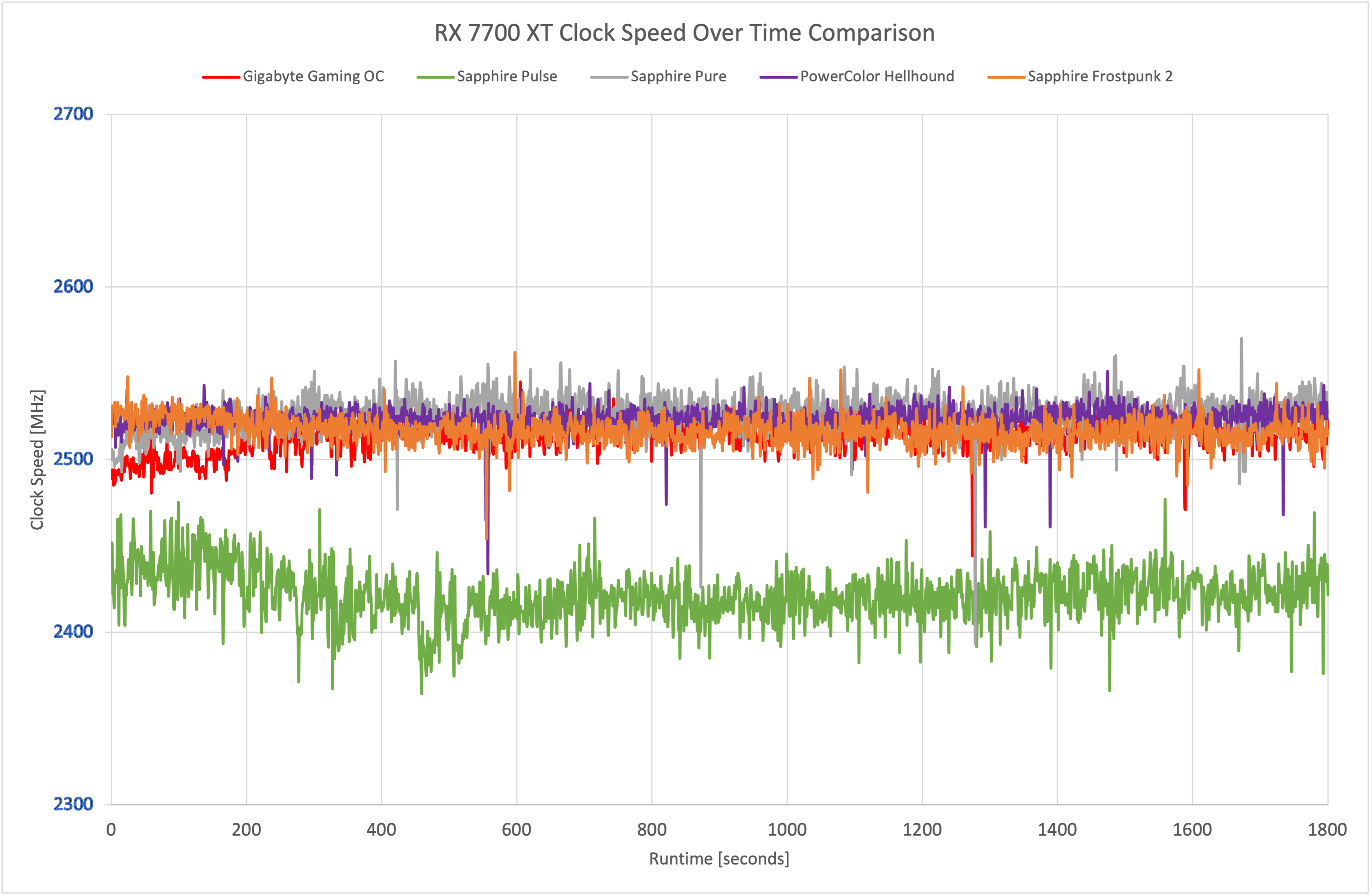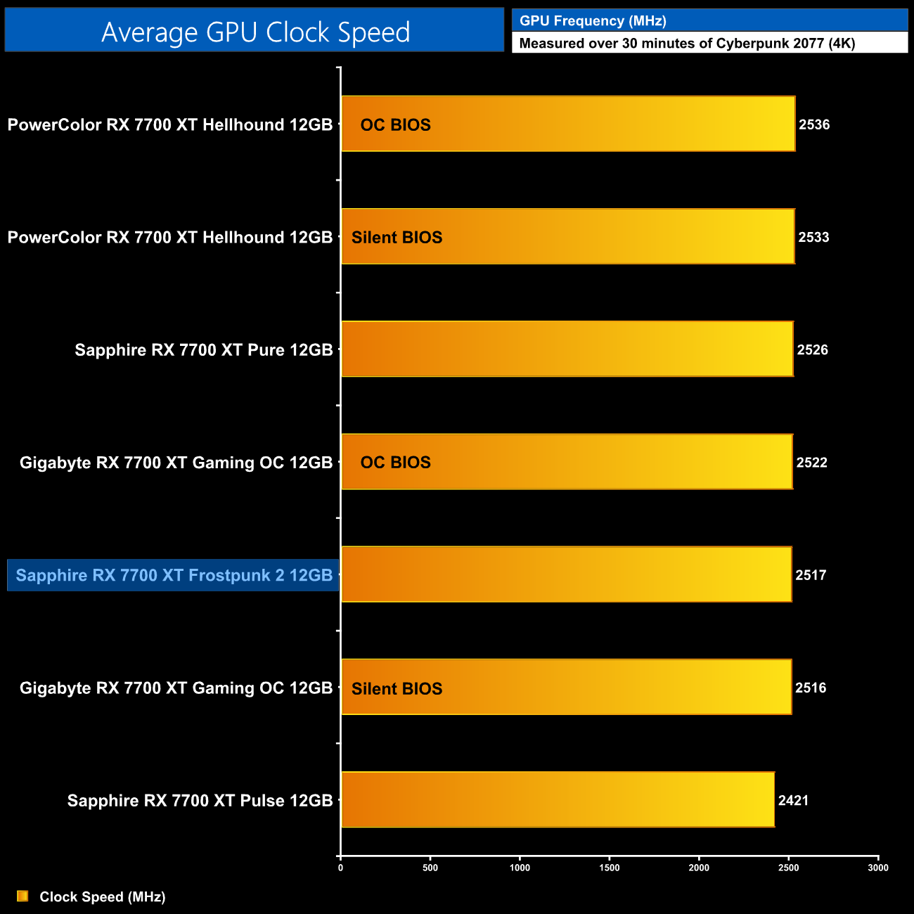 The reason for such close gaming performance becomes evidence when looking at clock speed – aside from the reference-clocked Sapphire Pulse, you can throw a blanket over the three factory overclocked cards as they all run within 20MHz of each other, including the Frostpunk 2 Edition, which averaged 2517MHz over our thirty minute stress test.
