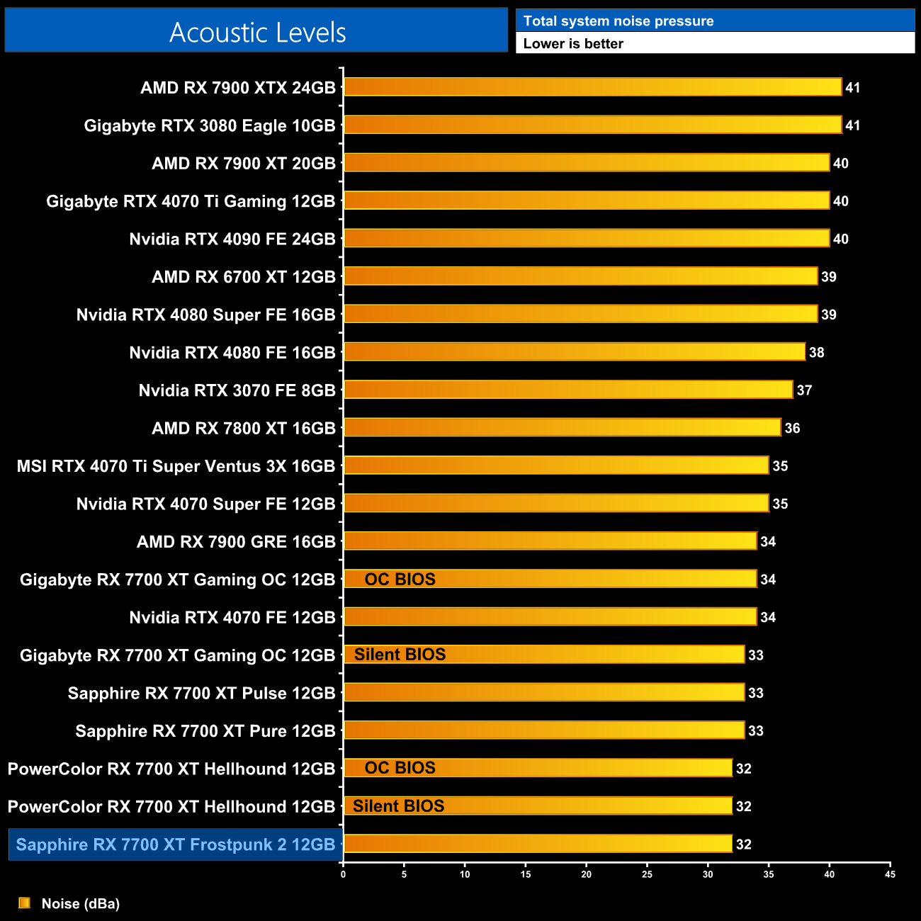 As mentioned, the Sapphire Frostpunk 2 card actually operated with slightly slower fan speeds than the regular Pure model, hitting 19%, or 930rpm fan speed – compared to 25%/1020rpm for the Pure. It's a very small difference but just enough to lower noise levels slightly, making this one of the quietest cards we have ever tested.