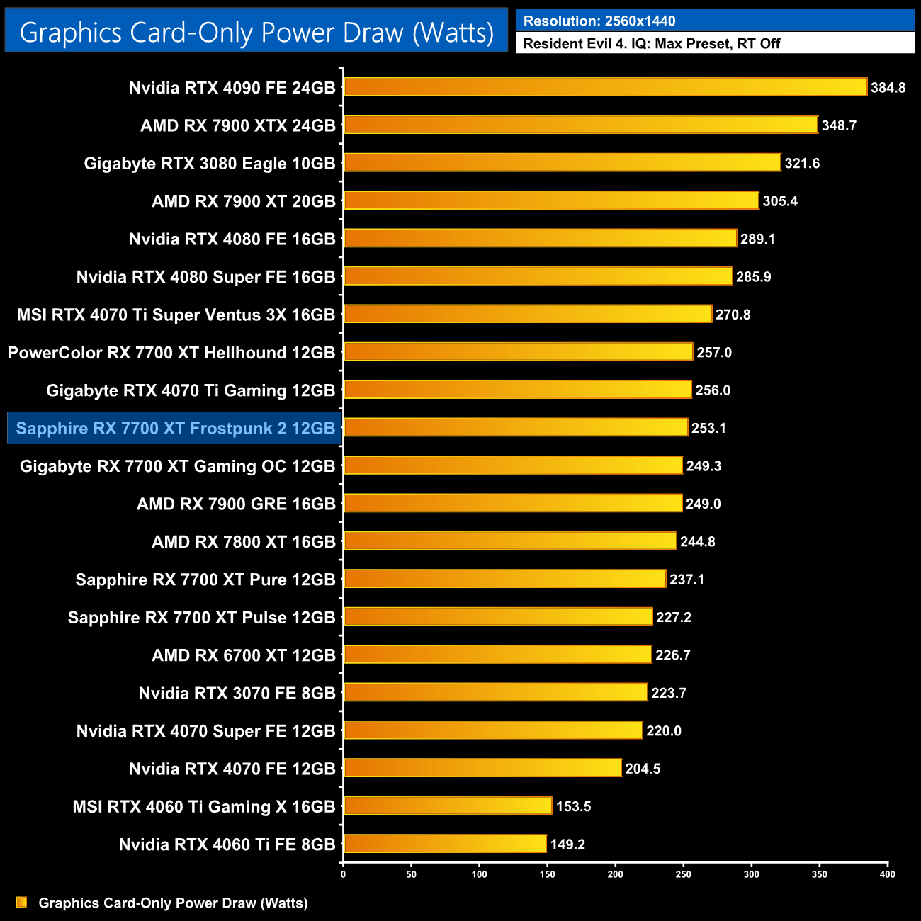 We use Nvidia PCAT to measure power draw of the graphics card only, with readings from both the PCIe slot and the PCIe power cables combined into a single figure. We use Resident Evil 4 (4K) for this testing.