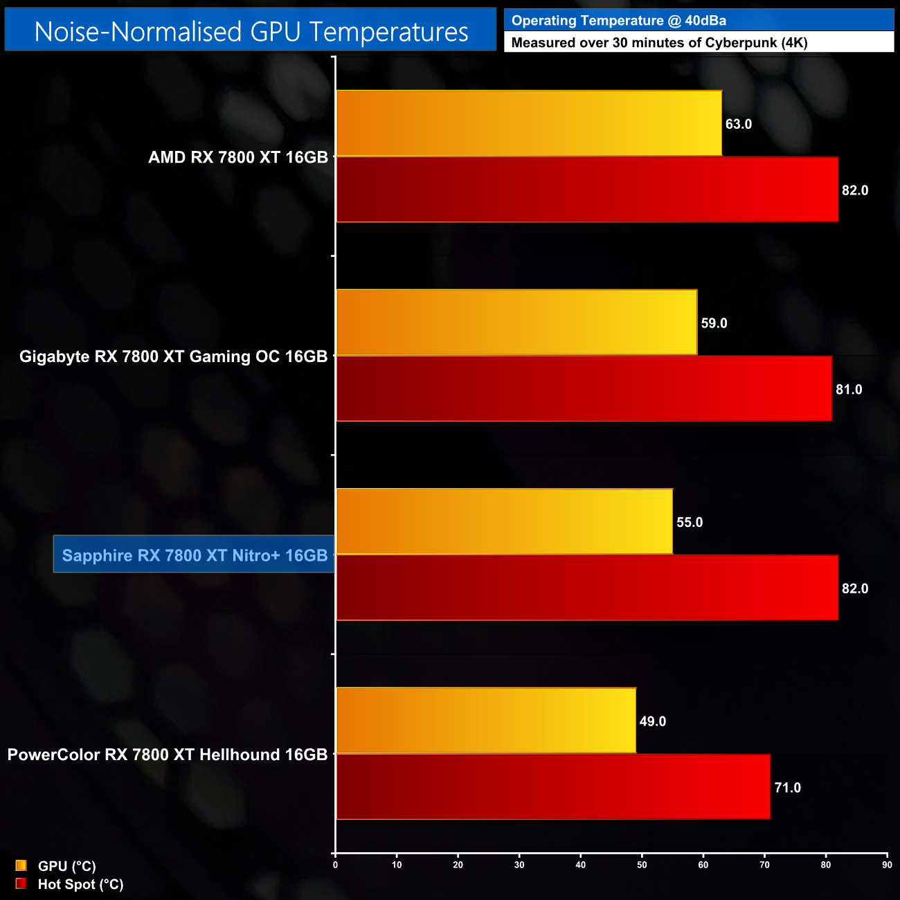 Following on from our stock thermal and acoustic testing, here we re-test the operating temperature of the GPU, but with noise levels normalised to 40dBa. This allows us to measure the efficiency of the overall cooling solution as varying noise levels as a result of more aggressive fan curves are no longer a factor.