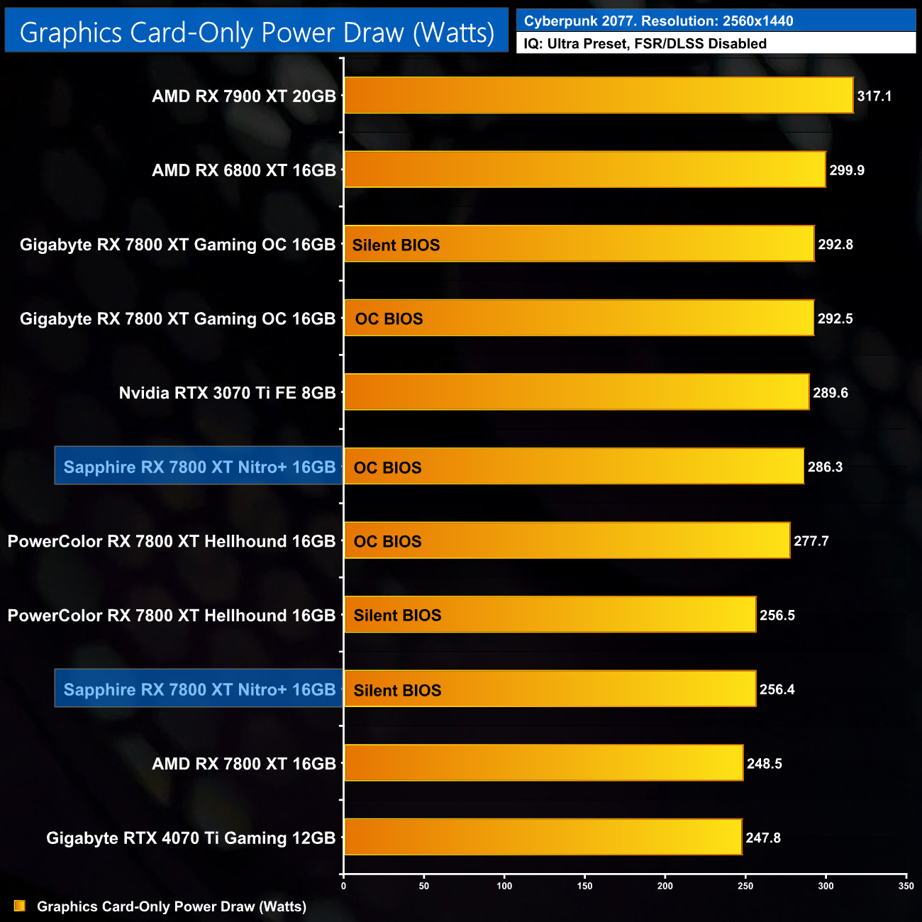 That increased power draw, coupled with small 2-3% performance gains, does mean efficiency is reduced for the Nitro+ – performance per Watt is 12% worse than the reference RX 7800 XT.