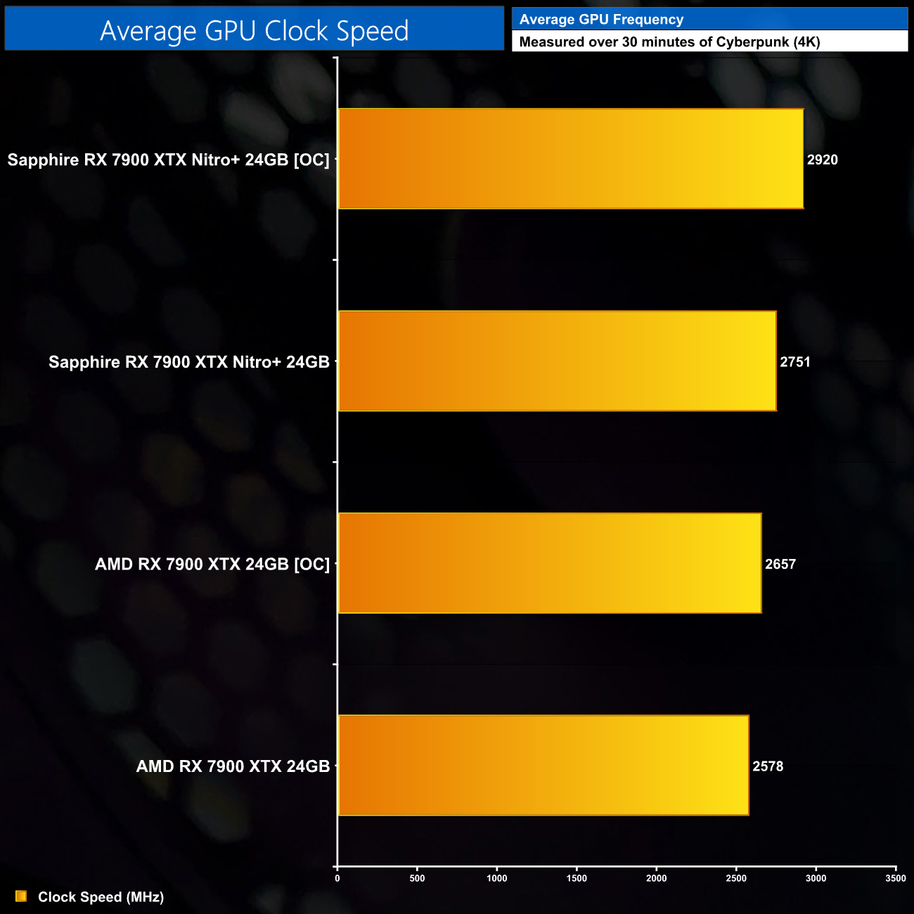 After having very limited success with our launch day RX 7900 XTX, we spent a bit more time overclocking the Nitro+. One key change we made was adjusting the voltage slider, and undervolting really helps with this GPU. We lowered this by 60mV, down from 1150 to 1090mV, while setting a maximum GPU clock of 3050MHz. The memory clock was adjusted to 2720MHz, with the power limit maximised at +15%.
