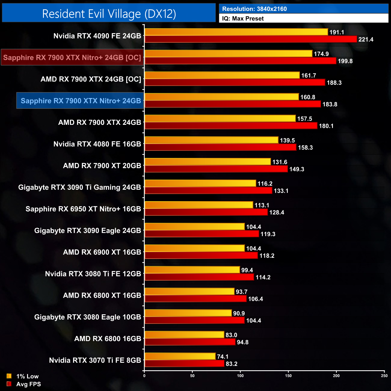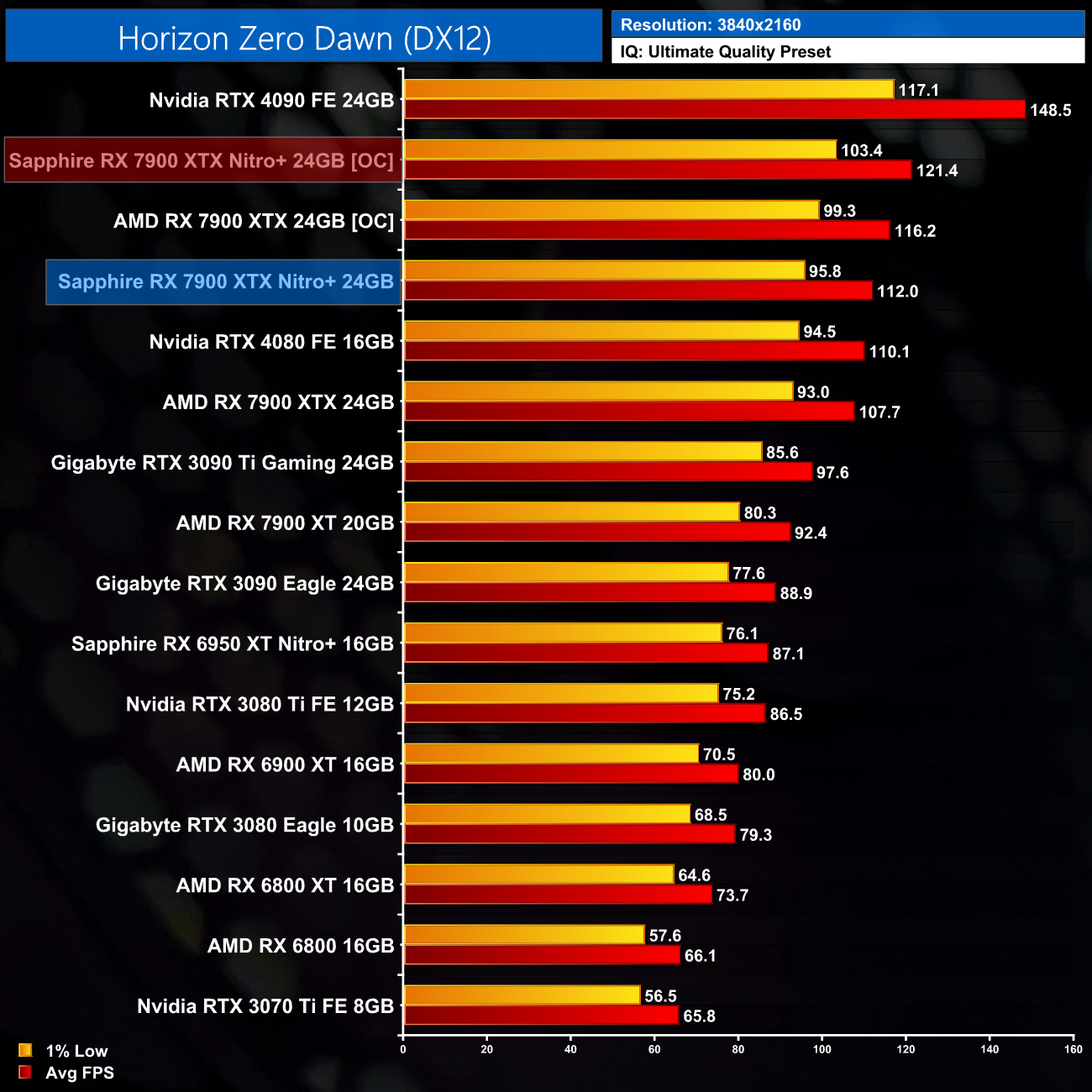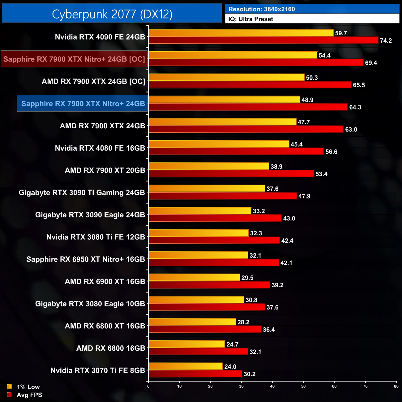 This overclock netted decent gains in our testing, far better that what we saw on launch day, with improvements coming in around 8% above the Nitro+ running its default clocks. In some cases the 7900 XTX was not too far off from the RTX 4090, though of course it never fully caught up.