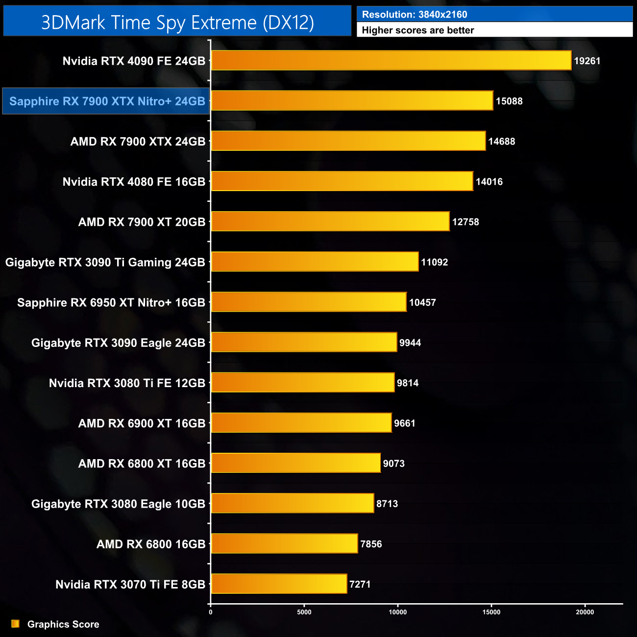 3DMark Time Spy Extreme shows performance coming in 3% higher than AMD's reference card, making the Nitro+ 8% faster than an RTX 4080 Founders Edition.