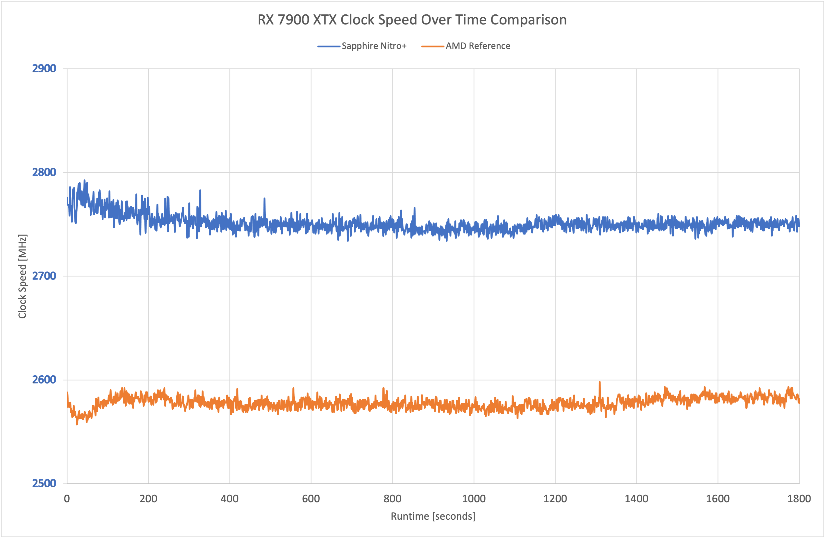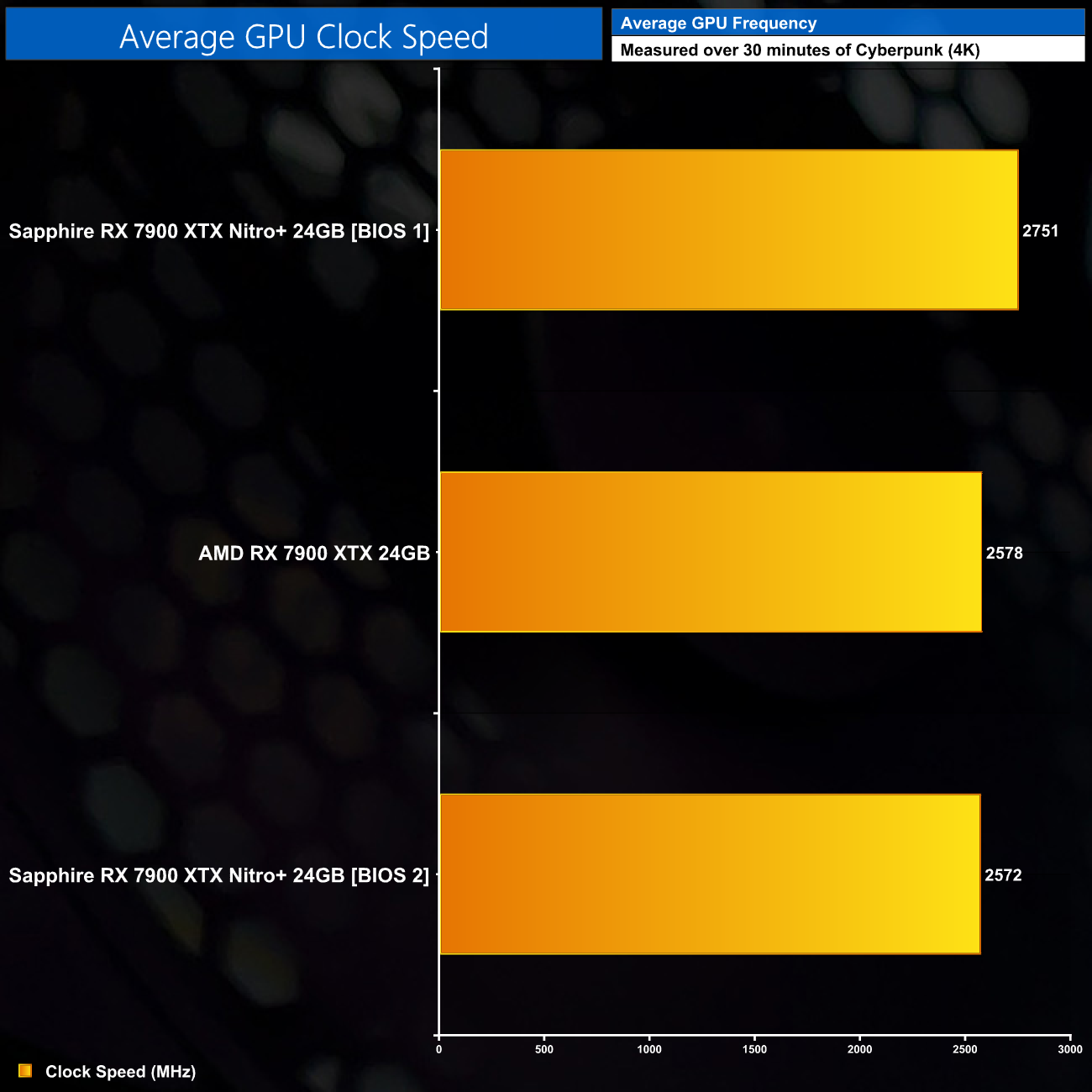 Getting testing under way with a look at clock speed, we can immediately notice how the extra power budget afforded to the Nitro+ directly translates into significantly raised clock speeds. BIOS 1 averaged 2751MHz over our thirty minute stress test, making it about170MHz faster than the reference design. BIOS 2 does run noticeably slower as a result of its reduced power limit, but even then overall performance closely matches AMD's reference card.