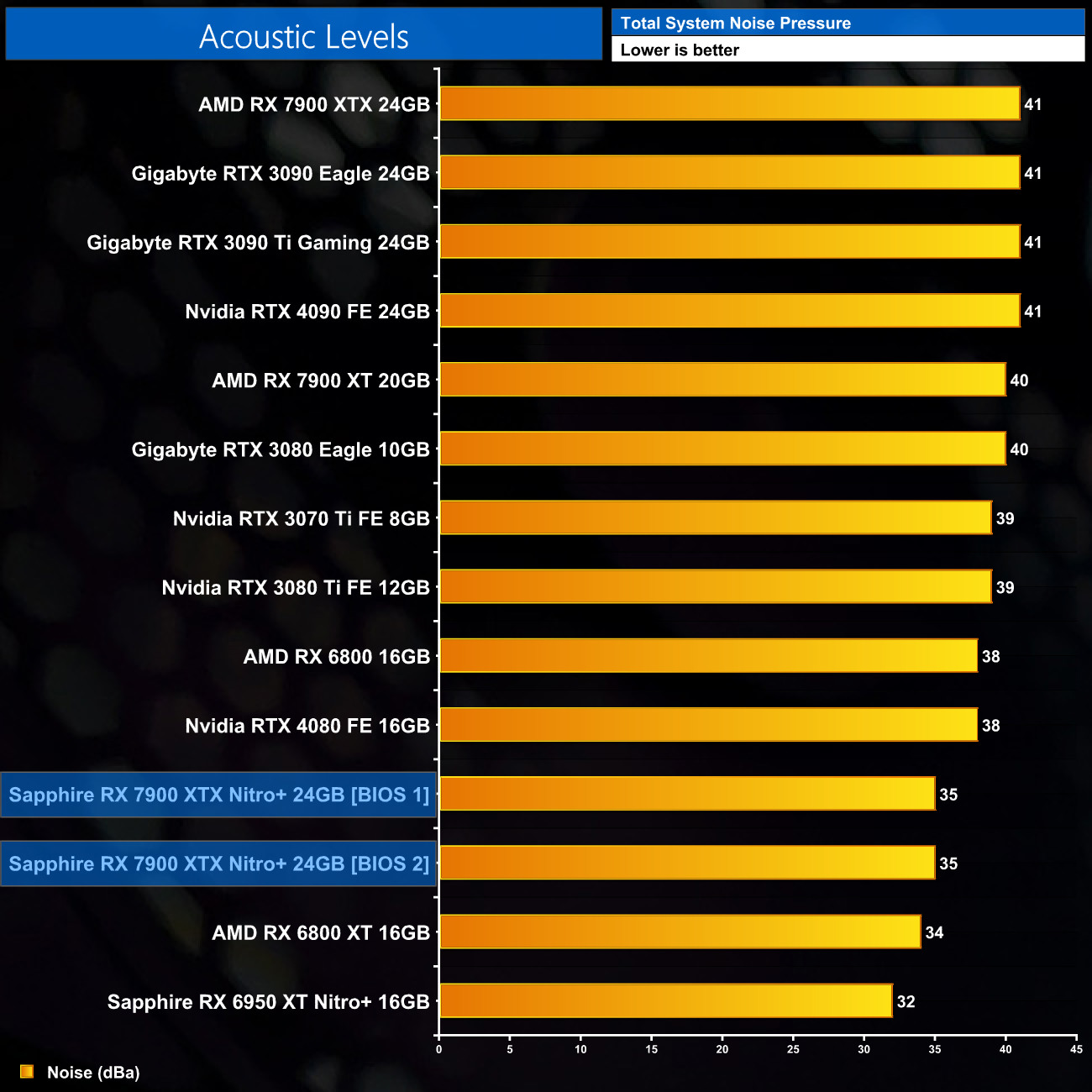 The thermal results look even better when taking noise levels into account – the Nitro+ operates at just 35dBa, so that's a healthy 6dBa reduction compared to AMD's reference card. Interestingly, noise levels are the same between BIOS 1 and BIOS 2, with both modes peaking at 36% fan speed, or around 1480rpm in our testing.