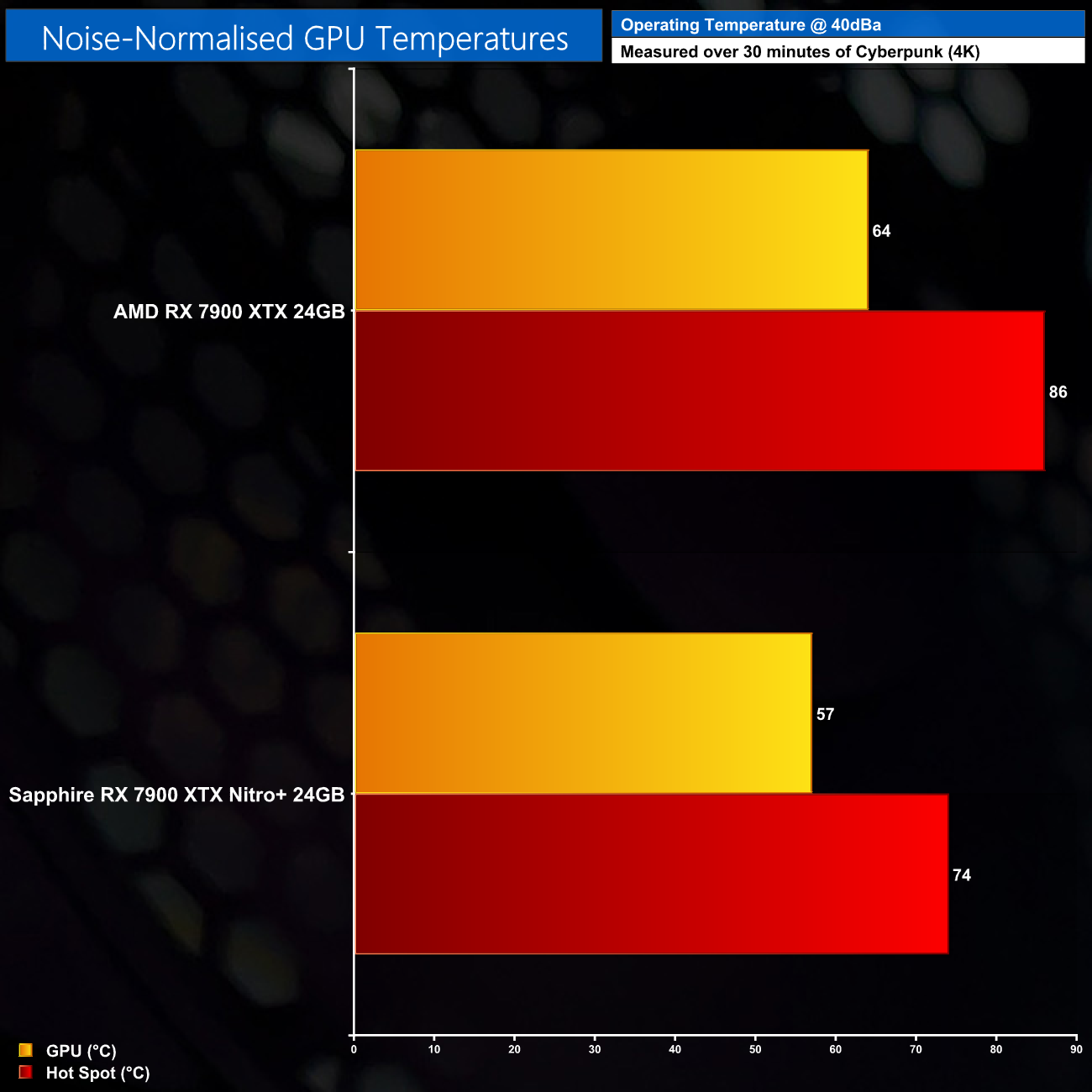 To produce 40dBa of noise, we increased fan speed to 48%, or about 1950rpm. This saw the Nitro+ run comfortably cooler than the reference design, offering a 7C reduction in terms of GPU thermals but a 12C reduction when looking at the hot spot temperature. This is also while operating at a higher power limit too, as noise-normalised thermals don't take power into account, making the design even more impressive.